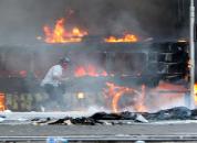 NAPOLI. Scene da guerriglia urbana stamani a Napoli. In piazza Carlo III un bus del trasporto pubblico è stato completamente bruciato da un gruppetto di persone con il volto travisato da passamontagna.