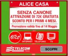 L’offerta Alice ADSL (clicca) di Telecom Italia è sempre promozionata sul web (www.alice.it), con ore gratis di traffico o di navigazione e gratuità del canone di attivazione.E’ un’offerta che, oltre alla qualità dei collegamenti ADSL e dell’assistenza ai clienti, offre inclusi nellofferta una vasta gamma di servizi gratuiti, quali ad esempio spazio web da 300 Mbyte, casella mail da 3 Giga, e molti altri.