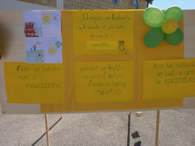 In occasione della manifestazione “Puliamo il Mondo”, organizzata in collaborazione con l’amministrazione comunale, su invito di Legambiente, gli alunni hanno realizzato dei lavoretti sul tema dell’ecologia e della salvaguardia dell’ambiente. I lavori sono stati poi esposti nel cortile della scuola: sotto un sole ancora gradevole, nonostante l’autunno inoltrato, è spuntato un enorme striscione con la scritta “Scuola pulita, bella è la vita”. Poi numerosi lavoretti, contornati da palloncini colorati, con frasi in tema, quali “fuori dal bidone non è educazione”, “se butti in giro il vetro il mondo torna indietro” e “non hai cultura se butti in giro la spazzatura”.