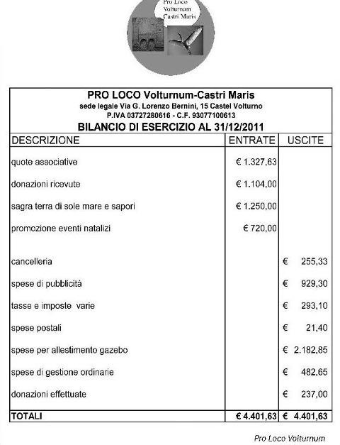 “In virtù del fatto che una Pro Loco che si rispetti non solo deve promuovere il territorio, ma ha il dovere di rendere pubblici i propri conti, abbiamo deciso di rendere pubblico il nostro Consuntivo che parla chiaro”, afferma Ive, che spiega: “Come si può notare non ci sono cifre esorbitanti, appena 4.401 euro di entrare con rispettive uscite. Eppure con questi quattromila euro circa (senza nessun aiuto economico del Comune di Castel Volturno, della Provincia e della Regione, ma con delle semplici donazioni private e con il nostro lavoro, a volte anche manuale) abbiamo espletato nel primo anno di vita una pedalata ecologica di successo, un incontro culturale con il sacerdote anticamorra, don Luigi Merola, realizzato un sito di informazione territoriale www.prolocovolturnum.com, effettuato una sagra estiva di successo con i cuochi del Campania Team, espletato uno spettacolo di danza, con la scuola di Gloria Palazzo, partecipato a decine di iniziative culturali per promuovere il territorio assieme allassociazione Le Sentinelle di Castel Volturno, dirette da Paola Castelli, al fine di riparare insieme i capanni o punti di osservazione sulloasi dei Variconi”.