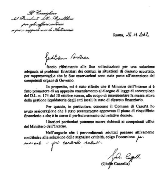 Il dottor Giulio Cazzella mi ha assicurato che le nostre sollecitazioni, per una soluzione adeguata ai problemi finanziari dei Comuni in situazioni di dissesto accertato, sono state sottoposte all’attenzione del Governo. In merito, il Quirinale ha avuto notizia dal Viminale di un emendamento al decreto legge del 10 ottobre scorso con il proposito di incrementare la massa attiva della gestione liquidatoria degli enti locali in stato di dissesto”. Lo dichiara il sindaco di Caserta, Pio Del Gaudio.