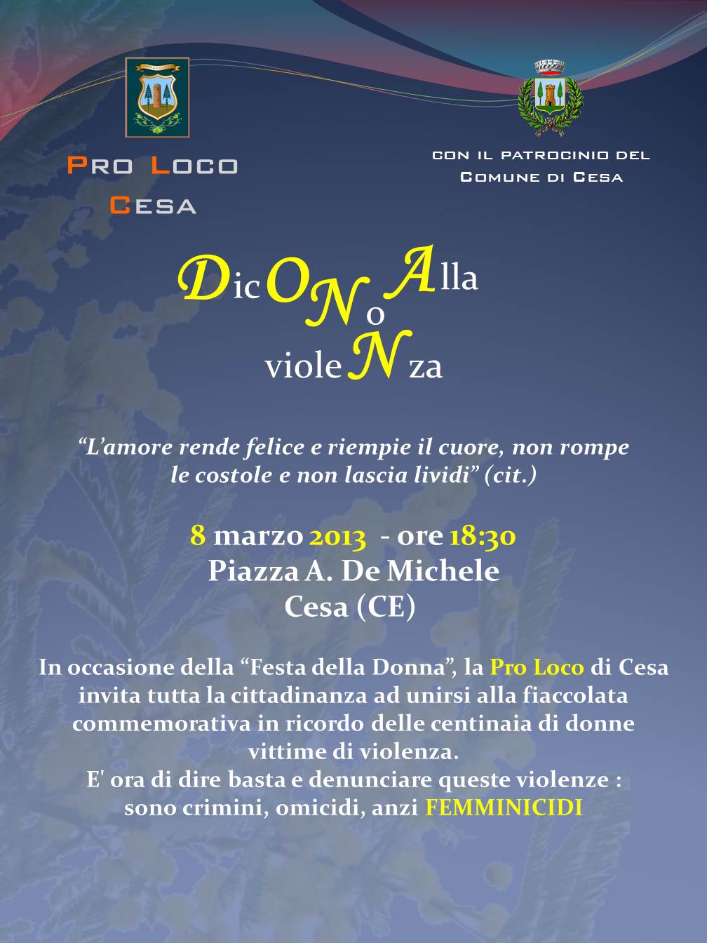 Per ricordare la tragedia quotidiana di queste donne, la Pro Loco, con il patrocionio del comune di Cesa,ha organizzato la fiaccolata DicO No alla violeNzA che attraverserà le principali strade del paese per poi concludersi nella chiesa di Maria SS del Rosario. La manifestazione si svolgerà in occasione della Festa della Donna, il prossimo venerdì 8 marzo con partenza da piazza De Michele alle ore 18:30. La Pro Loco di Cesa invita tutta la cittadinanza ad unirsi alla fiaccolata commemorativa in ricordo delle centinaia di donne vittime di violenza. E ora dire basta e di denunciare queste violenze che sono crimini, omicidi, anzi femminicidi.