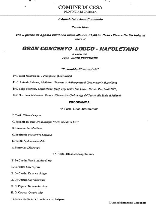 CESA. Gran concerto lirico-napoletano quello in programma, in piazza De Michele, sabato 24 agosto, alle ore 21, a cura del professor Luigi Petrone.