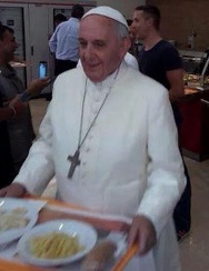 “Ha preso il suo vassoio, le posate, ha fatto la fila e l’abbiamo servito”, ha raccontato lo chef. Nel menù riso e pesce. La foto è stata rilanciata su Twitter dal direttore di Civiltà cattolica, padre Antonio Spadaro