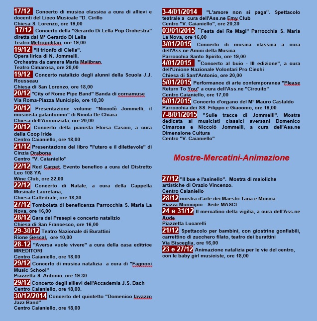 Agli eventi del Jommelli Cimarosa Festival, infatti, si aggiungono le iniziative deliberate dalla Giunta Comunale, con una nutrita serie di appuntamenti che si susseguiranno, quasi senza soluzione di continuità, fino al 8 gennaio 2015.