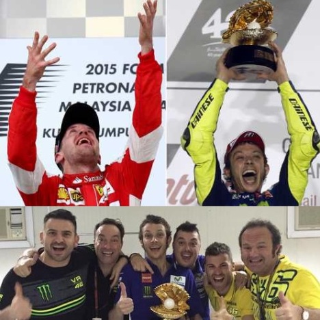La giornata perfetta per i motori azzurri ha avuto inizio domenica mattina a Sepang (Malesia), alle 8 ore italiane, e si è conclusa alle 20.47 a Losail (Qatar): un filo rosso ha collegato la straordinaria vittoria di Sebastian Vettel in Formula 1 all’ancor più strepitoso successo di Valentino Rossi, in MotoGp, in una gara che ha visto sul podio altri due azzurri, Dovizioso e Iannone, alla guida delle Ducati. Una domenica così non l’avrebbe sognata nemmeno il tifoso più accanito e ottimista. Riviviamola, minuto per minuto.