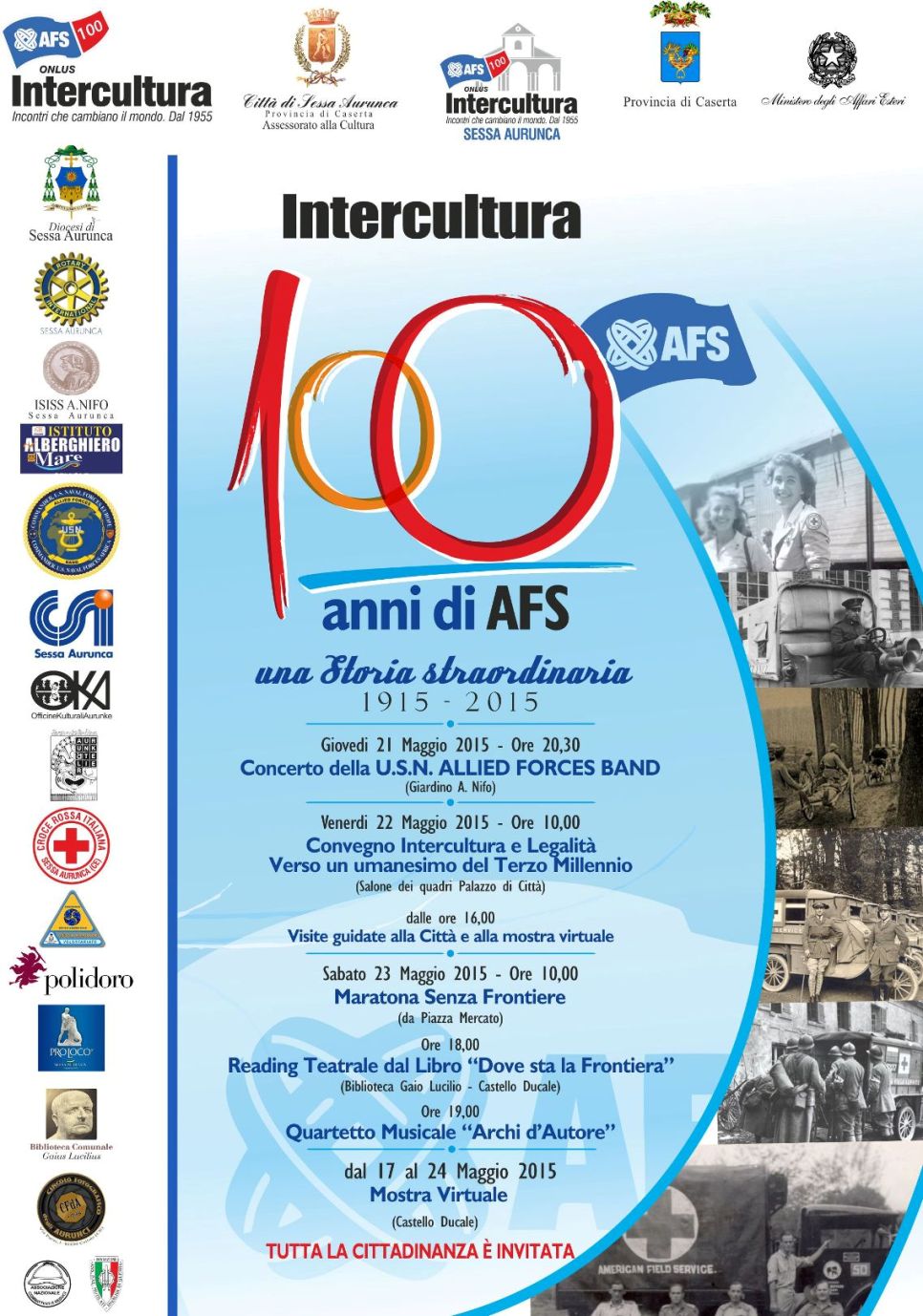 Il tema dell'”INTERCULTURA E LEGALITA’ VERSO UN UMANESIMO DEL TERZO MILLENNIO” rappresenterà il filo conduttore delle celebrazioni del Centenario dell’AFS a Sessa Aurunca e del concorso educativo indetto per le scuole del territorio. Un’occasione per riflettere sul tema del dialogo interculturale e della convivenza pacifica tra persone di culture diverse e per festeggiare insieme 100 anni di storia. La manifestazione si aprirà con il concerto di giovedì 21 alle ore 20.30 presso il Giardino Nifo, con l’orchestra dell’U.S.N. Allied Forces Band diretta dal Maestro, Tenente di vascello, David Latour.