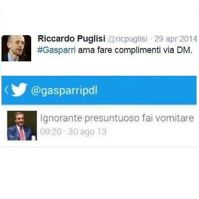 “Ignorante presuntuoso, fai vomitare”, aveva twittato in privato Gasparri il 30 agosto del 2013 a Puglisi, che difendeva Ciampi e il suo operato sulla lira e sulla lotta alla mafia mentre a dire del senatore, all’epoca del Pdl, l’ex presidente aveva affossato la valuta italiana e cancellato il 41bis ai boss.