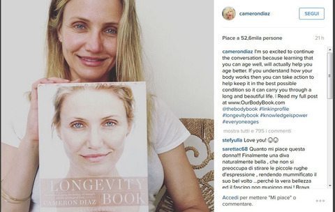 E’ proprio il titolo del libro il motivo per cui la Diaz ha deciso di regalare il post ai fan: “Capire che si può invecchiare bene – ha scritto sul social – ti aiuterà a invecchiare meglio. Se capite come funziona il vostro corpo – scrive Cameron Diaz accanto alla foto – allora puoi prendertene cura nel modo migliore”.