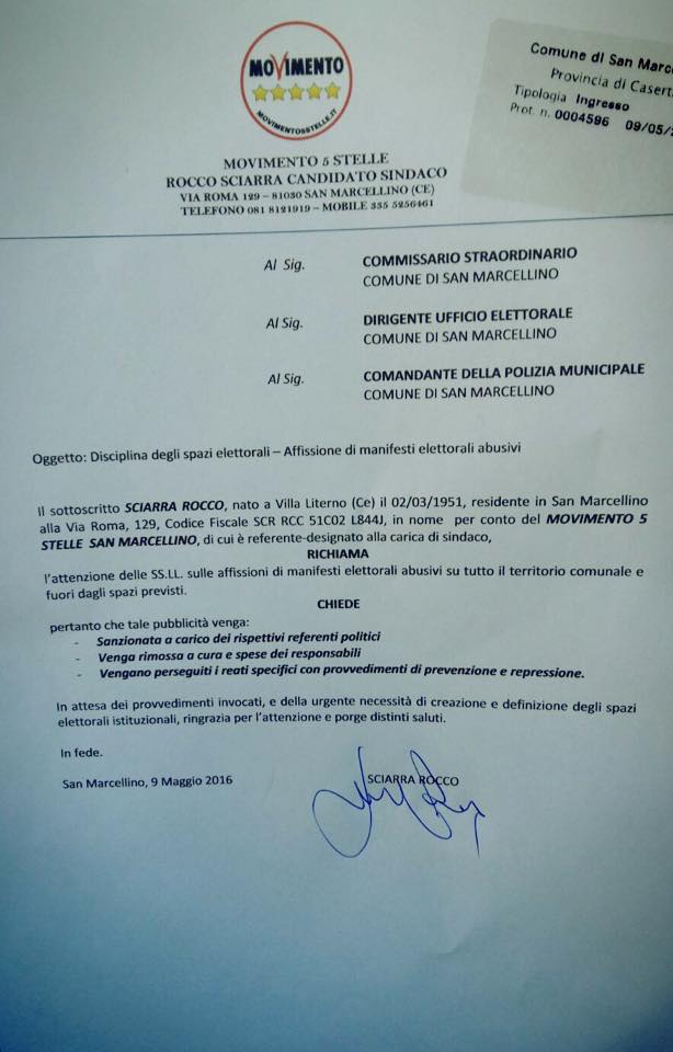 È per questi motivi che il M5S ha deciso di inviare alcune richieste (tra le quali: sanzioni a carico dei rispettivi referenti politici, rimozione a cura e spese dei responsabili, persecuzione dei reati specifici con provvedimenti di prevenzione e repressione) al commissario straordinario, al dirigente ufficio elettorale e al comandante della polizia municipale di San Marcellino.