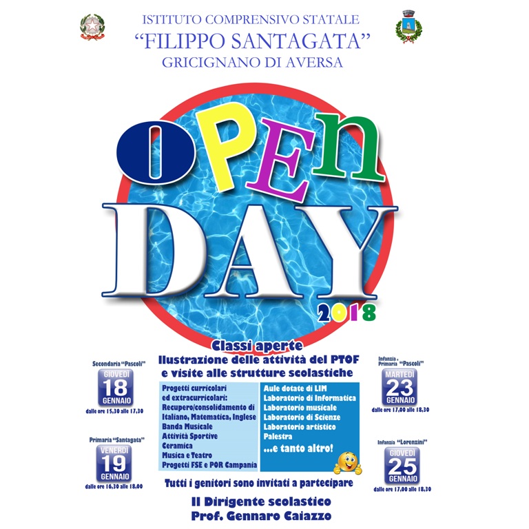 Una serie di appuntamenti con le famiglie promossa dall’istituto comprensivo “Santagata” di Gricignano, guidato dal dirigente scolastico Gennaro Caiazzo, per presentare le strutture e le attività didattiche in vista delle iscrizioni per l’anno scolastico 2018/19. Sono i cosiddetti “Open Day” che rientrano nell’ambito del percorso progettuale “Continuità ed orientamento”.