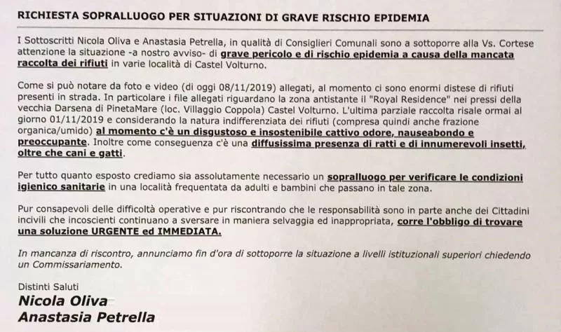 Gli esponenti di minoranza hanno allegato all’email foto e video realizzati lo scorso 8 novembre, sottolineando che “al momento ci sono enormi distese di rifiuti presenti in strada. Particolarmente interessata è la zona antistante lo storico ‘Royal Residence’ nei pressi della vecchia Darsena di Pinetamare, in località Villaggio Coppola, a Castel Volturno. L’ultima parziale raccolta dei rifiuti in questa zona risale, ormai, al primo di questo mese. Considerando la natura indifferenziata dei cumuli originatisi, compresa anche frazione organico-umida, gli odori creano disgusto, sono nauseabondi e preoccupanti. Inoltre, non mancano i ratti ed innumerevoli insetti, oltre che cani e gatti”.