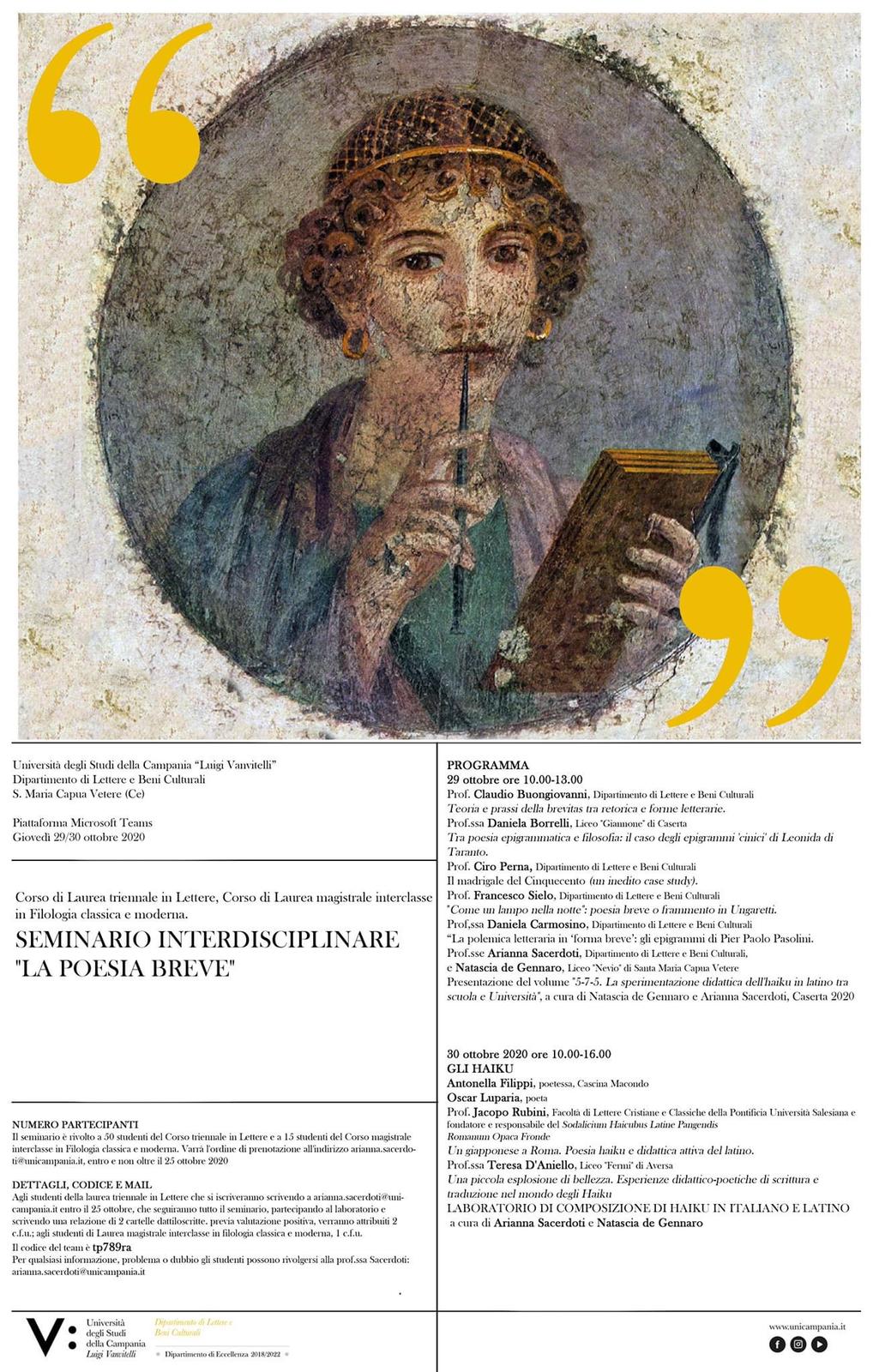 Ad aprire le danze della prima giornata sarà il presidente del corso di laurea in Lettere Moderne, Claudio Buongiovanni; a seguire i professori dell’Ateneo: Ciro Perna, Francesco Sielo e Daniela Carmosino e la professoressa del Liceo “Giannone” di Caserta, Daniela Borrelli. Dulcis in fundo della mattinata sarà la presentazione del volume “5-7-5. La sperimentazione didattica dell’haiku in latino tra scuola e Università” a cura della professoressa Sacerdoti e della professoressa Natascia De Gennaro. La seconda giornata, invece, si concentrerà soprattutto sugli haiku e vedrà come ospiti la poetessa Antonella Filippi e il poeta Oscar Luparia, e come relatori il professor Jacopo Rubini (Pontificia Università Salesiana) e la professoressa del Liceo “Fermi” di Aversa, Teresa D’Aniello. Inoltre, nel corso del seminario si terrà anche un laboratorio di composizione di haiku in italiano e in latino.