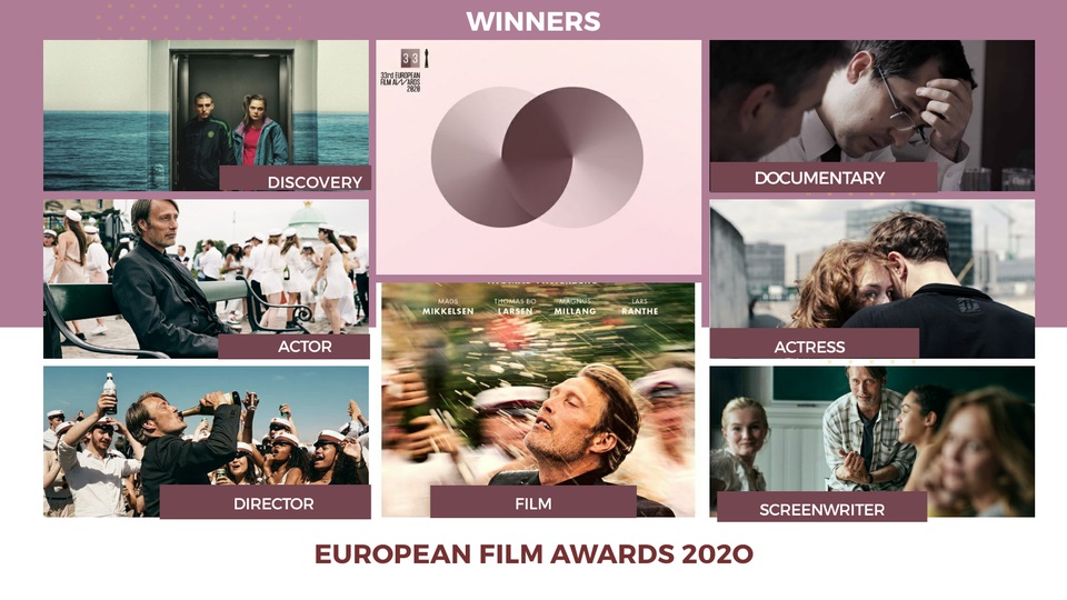 Si è conclusa la 33esima edizione degli European Film Award (Efa), meglio noti come Oscar del Cinema Europeo. La cerimonia di consegna, tenutasi a Berlino in formato virtuale, ha celebrato la Settima Arte scandinava grazie all’incontrastato trionfo del danese “Un altro giro” di Thomas Vinterberg, che ha portato a casa i premi per il film, la regia, la sceneggiatura e l’attore Mads Mikkelsen, davvero convincente nei panni di un professore frustrato nella quotidianità alla ricerca di emozioni a forte tasso alcolico. – continua sotto –