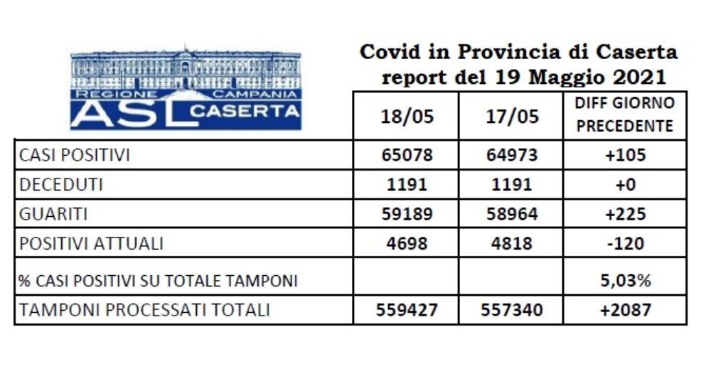 Non si arresta il calo dei positivi al Covid-19 in provincia di Caserta. Sono 4698, al 19 maggio, gli attuali positivi: 120 in meno rispetto al giorno 18. Altri 225 i guariti. Zero i decessi, un dato confortante dopo le 12 vittime registrate nel giorno precedente. E’ al 5% la percentuale dei casi positivi sul totale dei tamponi processati. Guarda i dati comune per comune: clicca qui – continua sotto –