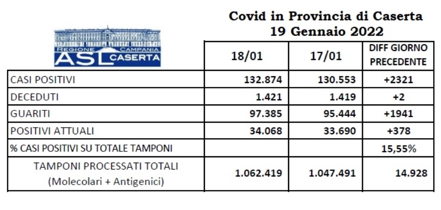 Al 19 gennaio 2022 continua a calare la curva dei nuovi positivi in provincia di Caserta dove si registrano altri 378 casi, un numero ben al di sotto della media dell’ultimo mese. Ben 1941, nelle ultime 24 ore, i soggetti dichiarati guariti. 2 decessi: a Castel Volturno e San Marcellino. Guarda i dati comune per comune: clicca qui