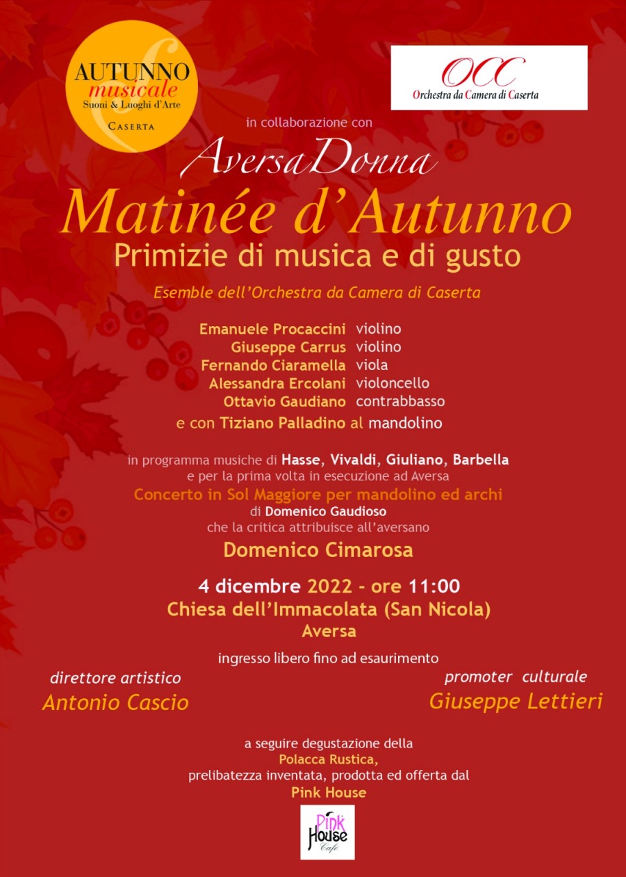 Aversa (Caserta) – Domenica 4 dicembre, alle ore 11, e ad ingresso libero, nella chiesa dell’Immacolata (nei pressi di piazza San Nicola e il quadrivio per la Maddalena) si terrà il Matinée d’Autunno “Primizie di Musica e Gusto”. – continua sotto –