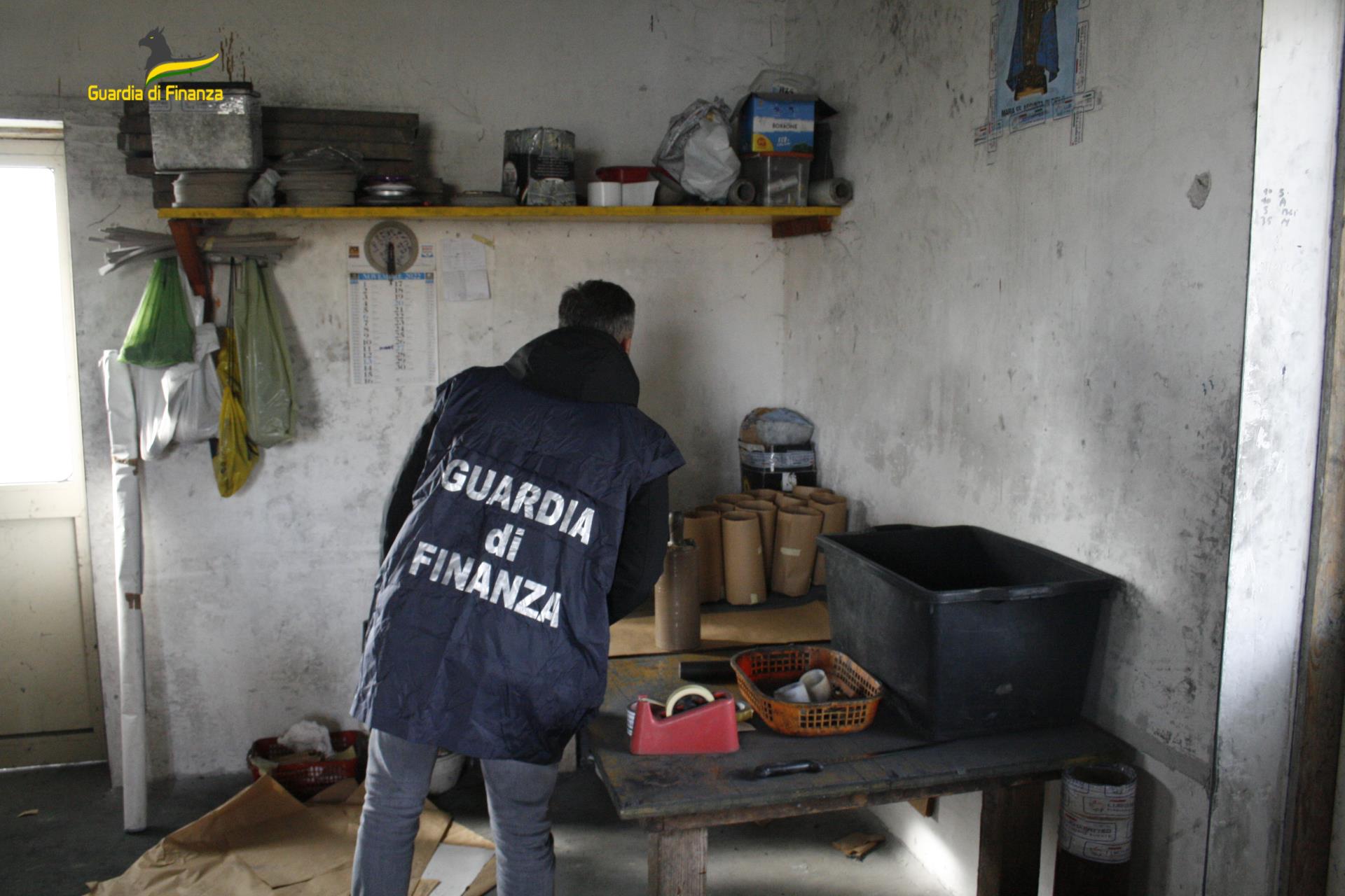 L’attività di controllo, effettuata anche con l’ausilio di personale specializzato artificiere, ha consentito di individuare un vero e proprio opificio dove è stato rinvenuto materiale pirotecnico nelle varie fasi della fabbricazione, polvere esplosiva, attrezzature e macchinari per la lavorazione ed il confezionamento, nonché prodotti semilavorati e prodotti finiti pronti per l’utilizzo.