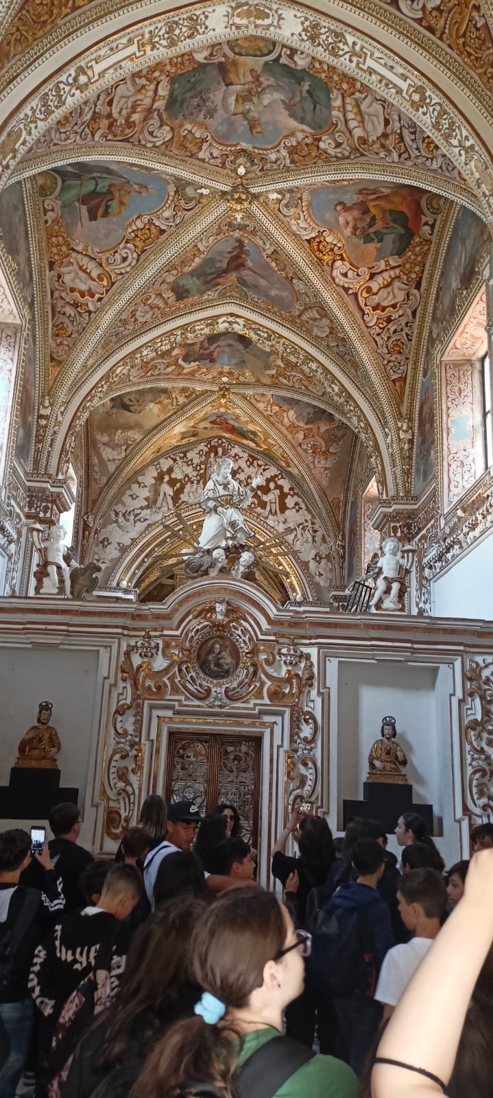 La comitiva ha poi fatto tappa alla Certosa di Padula, la prima certosa in Campania, uno dei più antichi monasteri certosini d’Italia, il secondo più grande in Europa dopo la certosa di Grenoble, in Francia, dichiarata nel 1998 patrimonio dell’umanità dall’Unesco. I ragazzi hanno ammirato la corte esterna, il chiostro della Foresteria con pitture seicentesche, la chiesa in cui si trovano la Sala del Capitolo, ricca di stucchi settecenteschi, e la Cappella dei Tesoro, che costituiva una sorta di cassaforte dove probabilmente veniva custodito e protetto il ricchissimo arredo della chiesa; e ancora la cucina, il refettorio, la biblioteca che conserva ancora migliaia di volumi tra libri, codici miniati e manoscritti, e il chiostro grande che, con i suoi quasi quindicimila metri quadrati di superficie, risulta essere tra i maggiori in Europa.