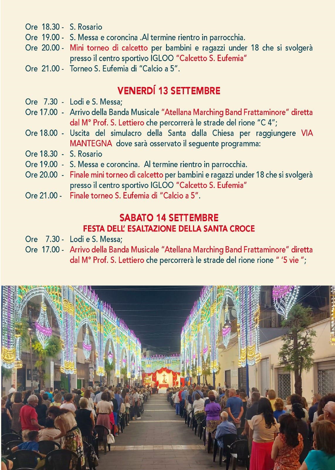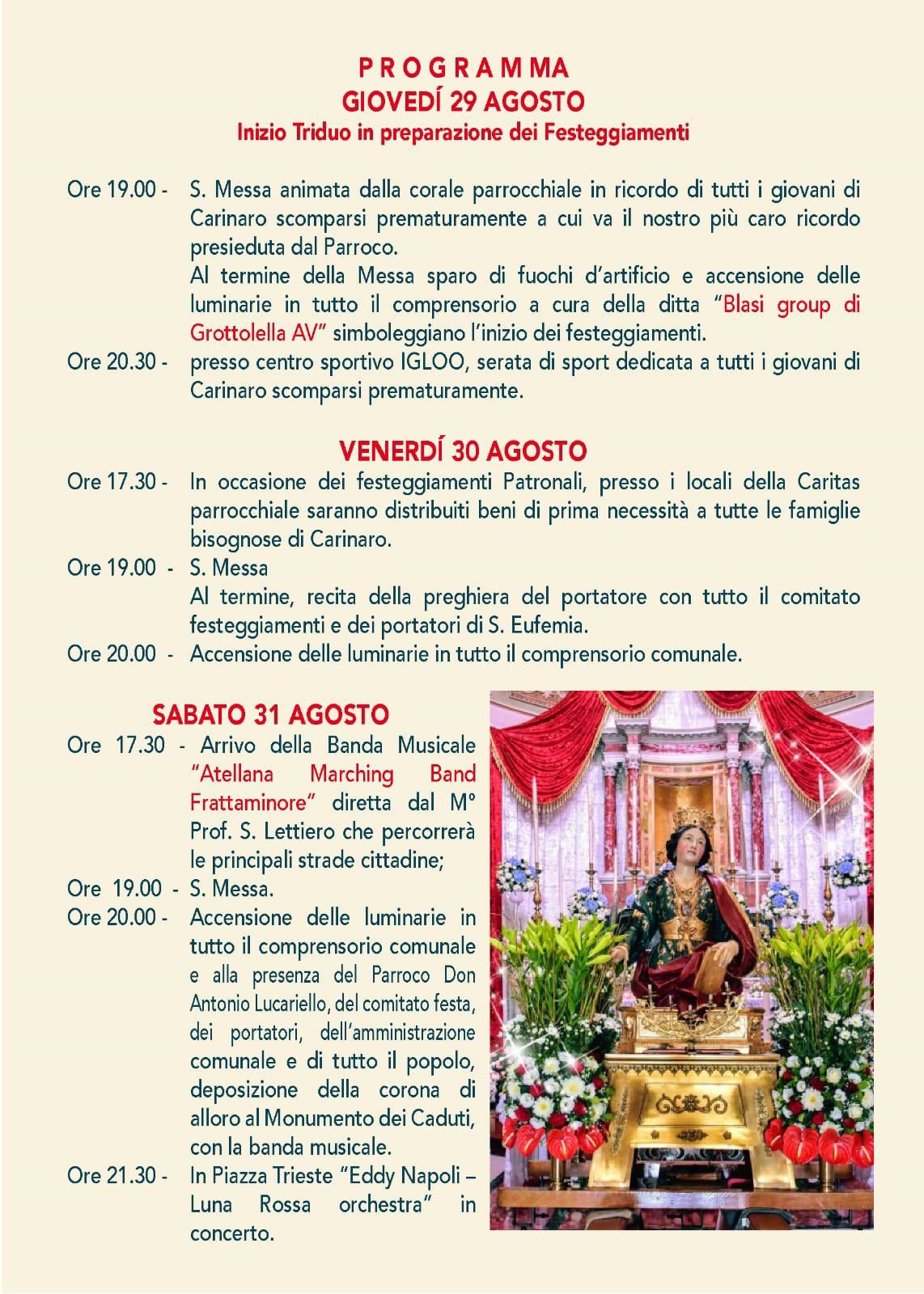 Carinaro (Caserta) – Si terranno dal 29 agosto fino al 22 settembre i tradizionali festeggiamenti patronali in onore di Sant’Eufemia. Ricco il programma di eventi promosso dal comitato presieduto dal parroco don Antonio Lucariello che si articola tra eventi liturgici e civili. Tra gli appuntamenti più attesi la processione del simulacro della santa lungo le strade cittadine, la tradizionale “Gara delle Mazze” e il concerto di Enzo Avitabile il 3 settembre in piazza. A seguire il programma completo
