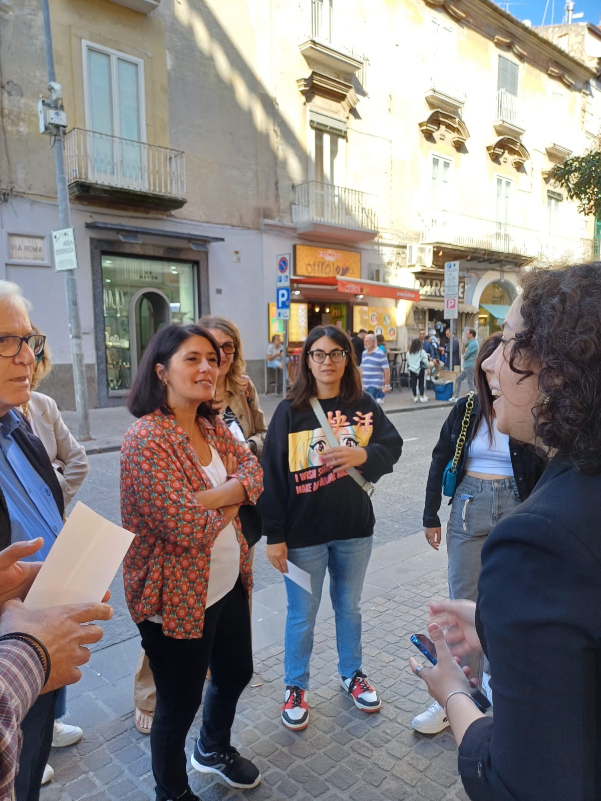 Tra le tappe la centralissima via Roma, nata il 10 marzo del 1304, per volere di re Carlo II, detto “lo zoppo”. Via Roma, come antica “Via Nova”, dove persistevano punti di ristoro e riposo per i viandanti; la strada in cui, nel 1701, furono impiccati e poi decapitati Pietro Marotta e Bartolomeo Cassese. Poi la maestosa Porta Napoli, conosciuta anche come “Arco dell’Annunziata”, costruita nel XVI secolo, simbolo del controllo della potenza angioina sulla città; arco inizialmente fatto con impasto di calce, per poi essere ricostruito nel 1777 con massiccio basamento in piperno. Le visite sono proseguite nei due palazzi di via Roma: il Palazzo Moccia, poi Russo, con lo stemma di Onofrio de Rossi, vescovo di Fondi, dove è vissuto il compianto professor Bruno Lamberti, tra i fautori di importanti iniziative culturali tra Aversa e l’agro aversano. Al civico 149, invece, visita alla maison di Giovanni Panettieri, designer di alta moda per sposa, ospitata in un antico salone di festa con decorazioni appartenenti alla seconda metà dell’ottocento.