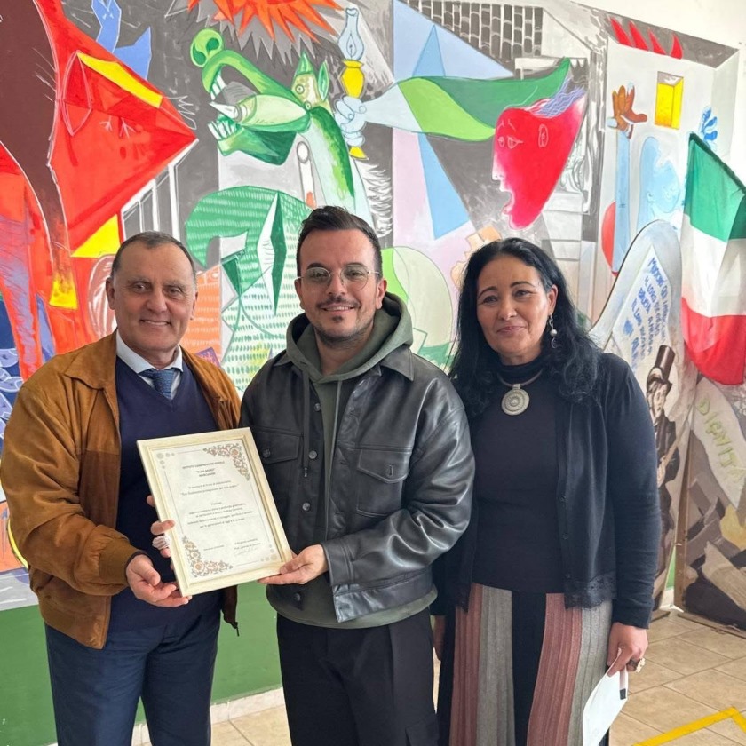 A rendere l’atmosfera ancora più speciale è stata la musica: l’orchestra del percorso musicale del “Moro”, preparata dai maestri Francesco Saverio Di Lillo (clarinetto), Domenico Birnardo (tromba), Luigi Ciriello (violino) e Luigi Marzano (pianoforte), ha accompagnato l’evento con esecuzioni magistrali. Il momento più emozionante è stato l’accoglienza dell’artista sulle note di “Abbracciame”, eseguita con grande intensità dal coro diretto dai maestri Luciana Cenname e Paolo Di Fuccia. SOTTO UNA GALLERIA FOTOGRAFICA