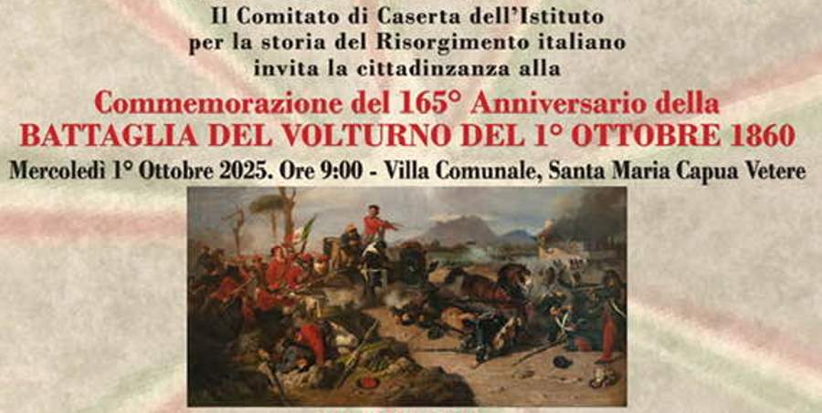 Mercoledì 1 ottobre, alle ore 9, sarà commemorata solennemente a Santa Maria Capua Vetere (Caserta), presso il monumento-ossario ubicato nella villa comunale, la Battaglia del Volturno del 1860. L’evento, promosso dal Comitato di Caserta dell’Istituto per la Storia del Risorgimento Italiano, diretto dalla professoressa Anna Poerio Riverso, si avvale del supporto organizzativo del Comune di Santa Maria Capua Vetere, dell’Associazione Nazionale Giuseppe Garibaldi, dell’Istituto Nazionale per la Guardia d’Onore alle Reali Tombe del Pantheon, dell’Unione Nazionale Ufficiali in Congedo d’Italia, dell’Associazione Alessandro Poerio.