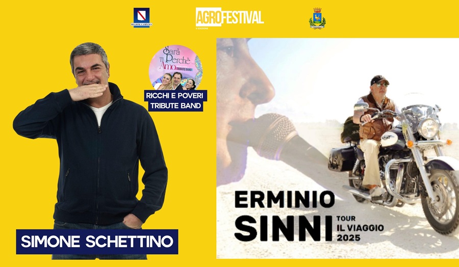 Infine, si chiude la sezione Live dell’Agro Festival con una tappa del tour “Il viaggio 2025”, con in scena il cantante Erminio Sinni. Il cantautore toscano, con alcune apparizione sul palco dell’Ariston a Sanremo, vincitore anche del Premio Mia Martini, che nel dicembre 2020 è stato il vincitore della prima edizione di “The Voice Senior”, condotto da Antonella Clerici. Cantante raffinato, dalla timbrica calda e possente, con la sua canzone “E tu davanti a me”, ha venduto milioni di copie, affermandosi nelle hit parade anche in America latina, hit che è diventata una icona degli anni Novanta. Questi saranno gli eventi live all’aperto, che si aggiungono a quelli già svolti con il concerto di Alessio e quello dei Parsifal, ma il programma di AgroFestival continua sino a dicembre, con tanti altri spettacoli e novità.