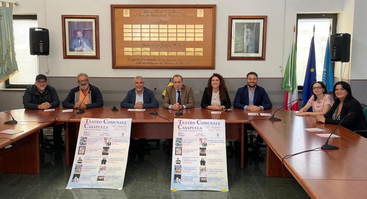 Casapulla (Caserta) – Il Comune di Casapulla celebra la cultura e la solidarietà con la tredicesima stagione teatrale 2025/26 del Teatro Comunale, a cura dell’associazione culturale e sportiva “Orizzonti”. La presentazione ufficiale si è tenuta nella sala consiliare del Comune, alla presenza del sindaco Ferdinando Bosco, dell’assessora ai Servizi Sociali Maria Sorbo, dell’Assessore alla Cultura Gianluca Sarogni, del direttore artistico Gianfranco Tecchia e delle collaboratrici Maddalena Natale e Maria Gravina.