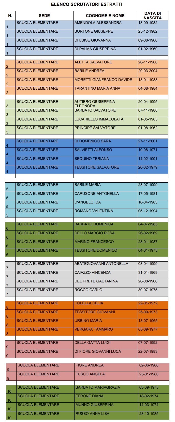 Estratti quattro scrutatori per ognuno dei dieci seggi che saranno allestiti nella scuola elementare “Filippo Santagata” di via Fermi. A seguire l’elenco:
