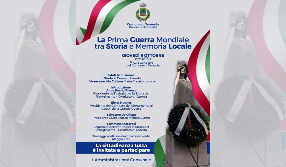 Teverola (Caserta) – Un invito alla memoria e alla riflessione storica. Giovedì 9 ottobre, alle ore 18.30, nella sala consiliare della casa comunale di Teverola, l’Amministrazione presenta su La “Prima Guerra Mondiale tra storia e memoria locale”, con un focus sul “Passaggio dalla neutralità all’intervento nel maggio 1915”.
