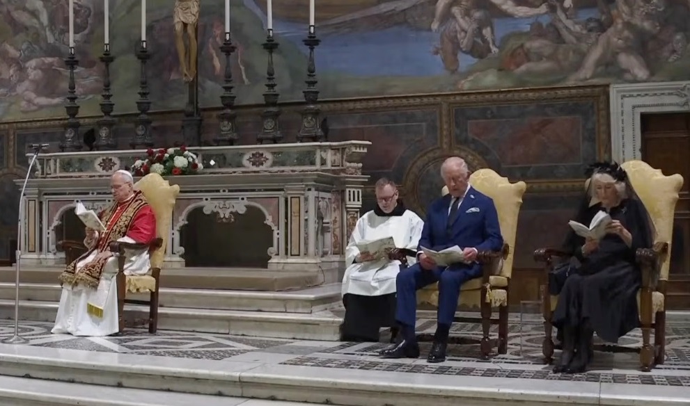 Un silenzio denso, il respiro dei cori e la volta michelangiolesca come testimone: nella cappella Sistina Re Carlo e Regina Camilla hanno pregato con Papa Leone, firmando il passaggio simbolico più potente della visita di Stato in Vaticano. Non accadeva da cinquecento anni, dai giorni della Riforma anglicana, che il capo della Chiesa cattolica e il sovrano d’Inghilterra si unissero nella stessa preghiera.