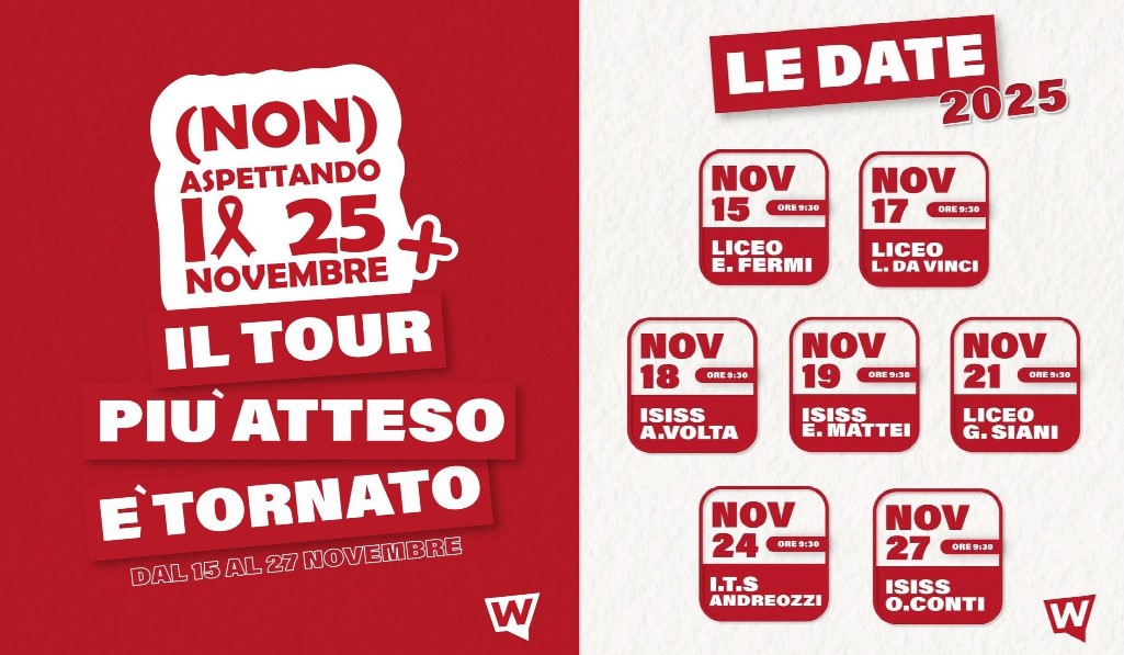 Il tour durerà due settimane, dal 15 al 27 novembre, in cui verranno effettuati diversi incontri, in molte scuole: il liceo scientifico “Enrico Fermi”, l’istituto “Leonardo da Vinci”, l’istituto “Alessandro Volta”, l’Isiss “Enrico Mattei”, il liceo scientifico “Giancarlo Siani”, l’istituto tecnico “Carlo Andreozzi” e l’Isiss “Ovaldo Conti”. Ma l’associazione promuoverà anche altre manifestazioni riguardo la violenza di genere sul territorio.
