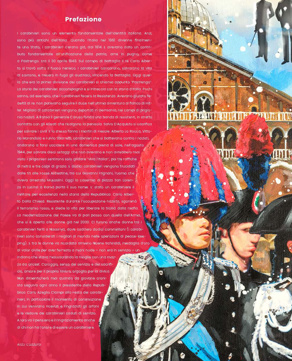 Prefazione e postfazione – Nella prefazione Aldo Cazzullo ripercorre la storia dell’Arma dal 1814 a oggi, evidenziandone il ruolo nella costruzione dell’Italia e rendendo omaggio ai caduti. In chiusura, la postfazione di Massimo Lugli racconta un episodio personale che incarna lo spirito di servizio e la prontezza dei militari.