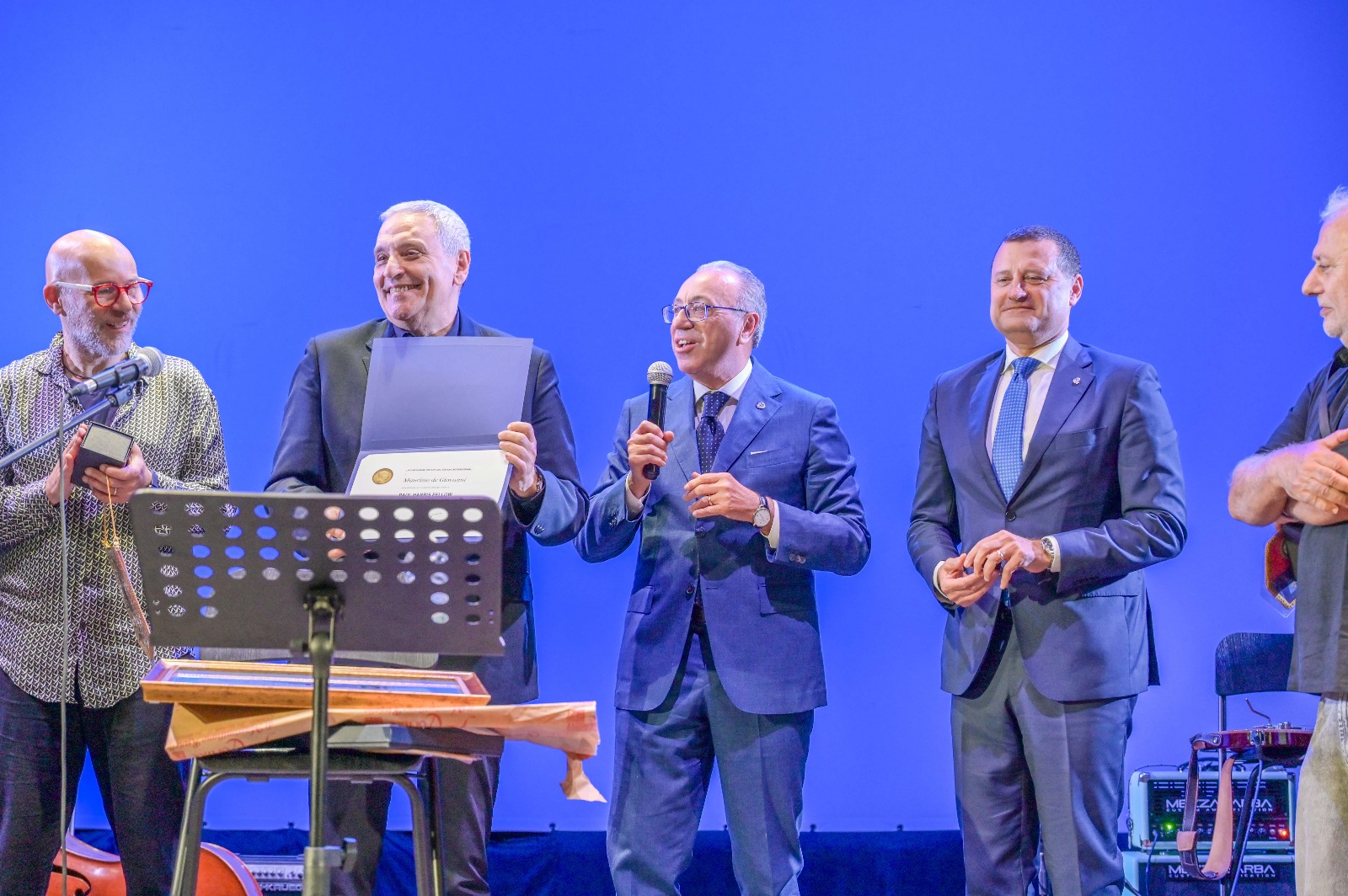 Al termine dello spettacolo, Russo ha conferito a Maurizio de Giovanni la “Paul Harris Fellow”, ovvero la massima onorificenza rotariana, e ha consegnato all’artista, a nome del Club e a titolo personale, un arazzo e un’altra creazione in seta di San Leucio. SOTTO UNA GALLERIA FOTOGRAFICA
