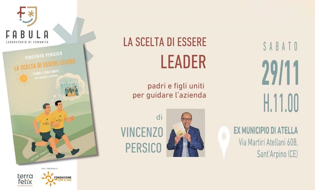 La presentazione a Sant’ArpinoLa scelta di essere leader sarà presentato sabato 29 novembre, alle ore 10.30, negli spazi di Fabula – Laboratorio di Comunità, in via martiri Atellani, a Sant’Arpino. Insieme all’autore interverranno imprenditori che porteranno testimonianze dirette di crescita e trasformazione nelle rispettive attività: Mimmo Milone di Magiexpress, Vincenzo Migliaccio di Autotrasporti Migliaccio Vincenzo (Napoli) e Massimo Lucciola di Bocciolas Studio di Santa Maria Capua Vetere.