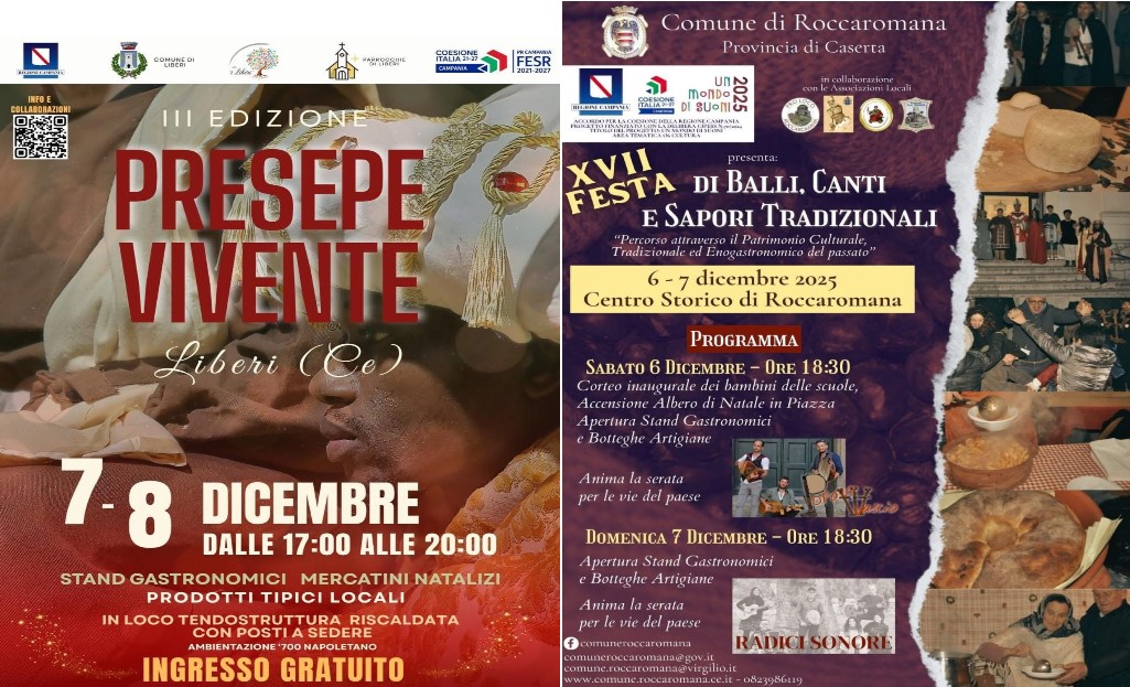 Un Presepe Vivente tra i vicoli di Villa, a Liberi, e una festa di balli, canti e sapori tradizionali a Roccaromana hanno trasformato il ponte dell’Immacolata in un viaggio nelle radici popolari del Monte Maggiore, sotto il segno del festival intercomunale Un Mondo di Suoni. Un cartellone di appuntamenti che, da sabato e fino a oggi, lunedì 8 dicembre, ha animato i centri storici dei due borghi, grazie al programma di percorsi turistici di tipo culturale, naturalistico ed enogastronomico per la promozione turistica della Campania, finanziato con i fondi per lo sviluppo e la coesione 2021-2027 assegnati dalla Regione.