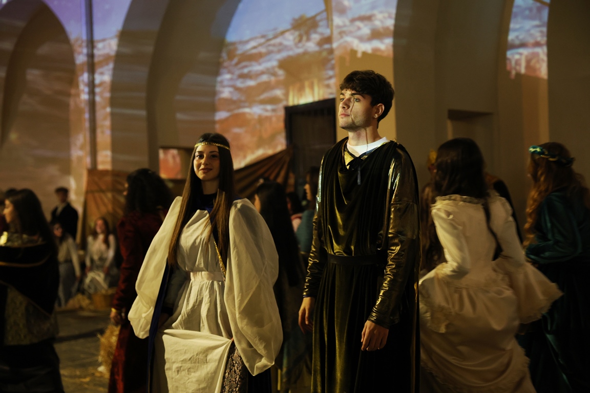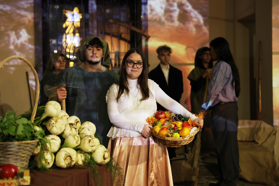 Il sogno di Benino – Figura centrale della narrazione è stata quella di Benino, il pastore dormiente che sogna l’intera Natività. L’interpretazione di uno studente dell’istituto ha permesso di offrire una chiave di lettura simbolica del presepe come spazio di incontro tra divino e umano, invitando il pubblico a guardare oltre le apparenze e a ritrovare, anche nel presente, il senso autentico della meraviglia natalizia.