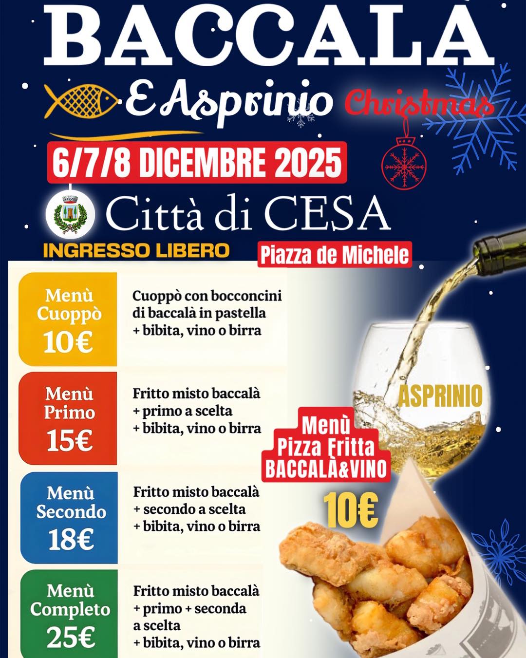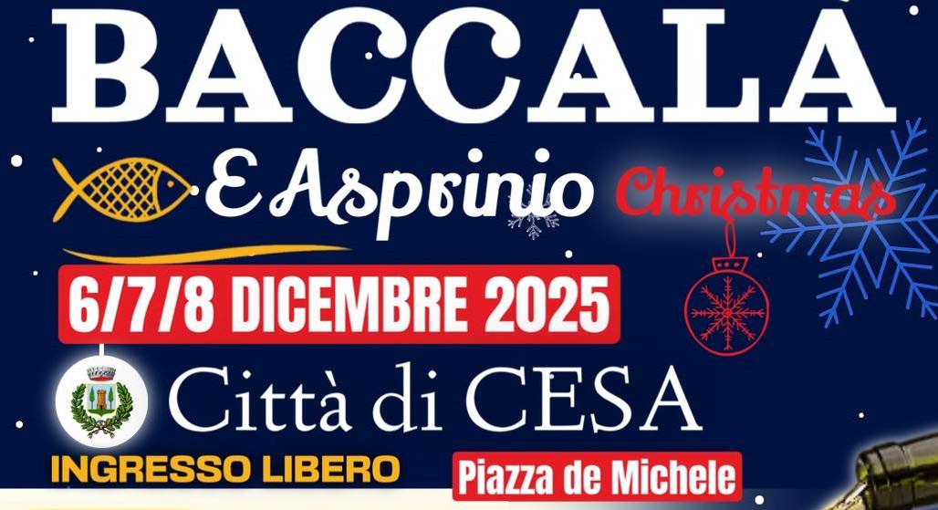 Cesa (Caserta) – La tradizione incontra l’identità territoriale e si veste di festa. Dal 6 all’8 dicembre, Baccalà & Asprinio – Christmas Edition porterà a Cesa un’esperienza gastronomica che promette di accendere piazza De Michele con profumi, storie, sapori e calici di una terra che custodisce un patrimonio enologico unico. Accanto allo chef Antonio Peluso, questa edizione natalizia si prepara a valorizzare un ingrediente simbolo della cucina campana e un vino che affonda le sue radici nelle alberate aversane.