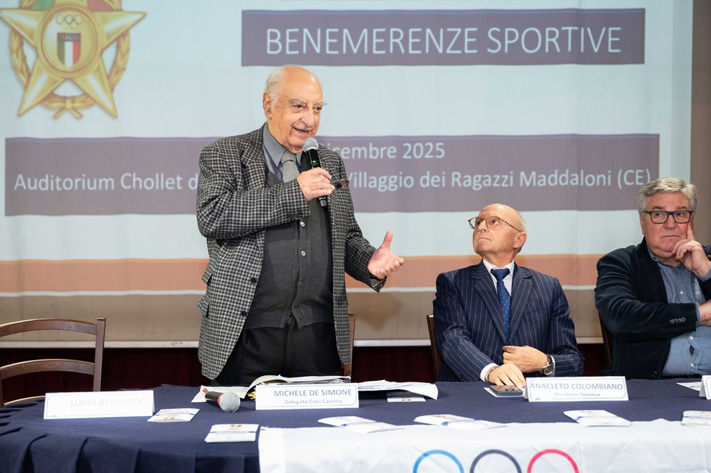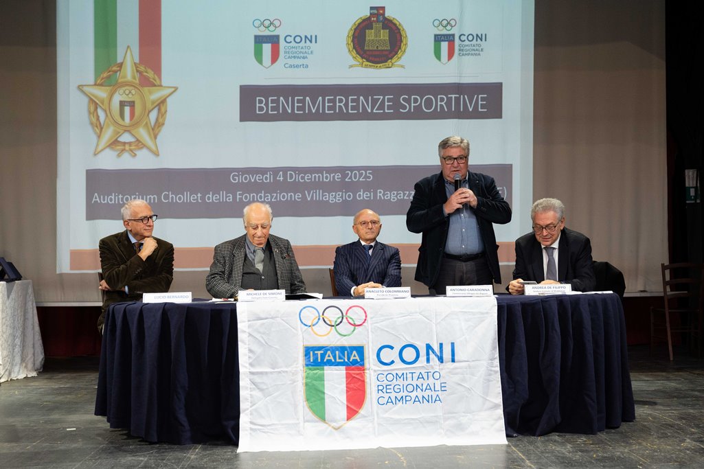I benemeriti del 2025 – Lunga la sfilata degli insigniti dal Coni nazionale con le Stelle al Merito Sportivo: i dirigenti Alberto Biagino, Francesca Dattilo, Bruno Fabozzi, Vincenzo Corcione e Vincenzo Sabatasso; i tecnici Gianfranco Moccia, Salvatore Napolitano, Giuseppe Romano e Giuseppe Sanvitale; gli atleti Sirine Chaarabi (boxe), Matteo Fiore e Alessandro Iodice (karate), Pierluigi Sagnella (biliardo), Ferdinando Cantelli (pesca), Deborah Carangelo (basket) e Anna Cuorvo (taekwondo).
