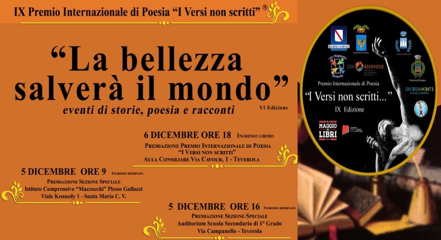 L’evento e le sedi – Promosso dall’associazione Si Teverola Odv, con la collaborazione di Migr-Azioni Aps, DiversaMente Odv e Uniti per Sant’Elena Odv e con il contributo della Regione Campania, il Premio Internazionale di Poesia “I Versi non scritti…” partirà il 5 dicembre con due momenti dedicati agli istituti scolastici e ai partecipanti delle sezioni speciali: alle ore 9 presso l’Istituto Comprensivo “Mazzocchi” – Plesso Gallozzi, in viale Kennedy 1, a Santa Maria Capua Vetere, e alle ore 16 nella Sala Convegni della Scuola Secondaria di Primo Grado, in via Campanello, a Teverola.