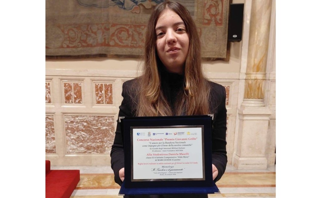 Marcianise (Caserta) – La Sala Regina di Montecitorio si è trasformata, lo scorso lunedì, nel palcoscenico di un riconoscimento che porta il nome di Marcianise sul piano nazionale. Protagonista la giovane Daniela Muselli, alunna della classe 2A dell’Istituto Comprensivo “Aldo Moro”, insignita del prestigioso premio “Giovanni Grillo” nel corso di una cerimonia seguita anche in diretta streaming sui canali istituzionali.