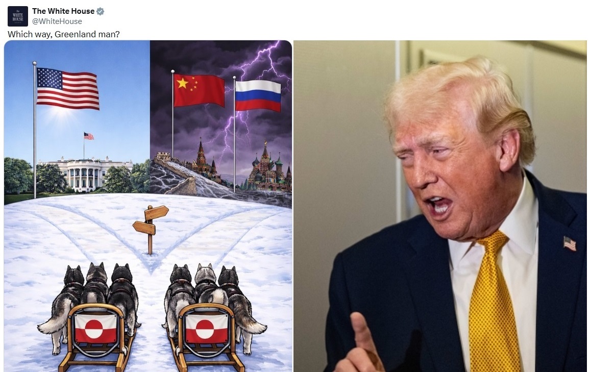 La propaganda passa dai social – In questo scenario sempre più teso si inserisce anche la comunicazione della Casa Bianca. «Da che parte stai, groenlandese?» è la domanda che campeggia su un post pubblicato su X. L’immagine, volutamente caricaturale, mostra una slitta trainata da cani davanti a un bivio geopolitico: da un lato gli Stati Uniti, promessi come un futuro “radioso”, dall’altro la tempesta che conduce verso Cina e Russia. Un messaggio semplice, diretto e provocatorio, che punta a incasellare la scelta dell’isola in una contrapposizione netta.