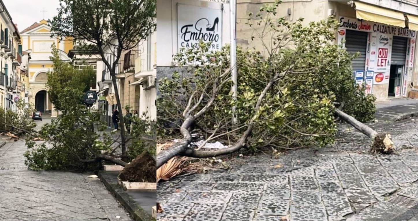 Aversa (Caserta) – Meno di un minuto è bastato per scatenare raffiche impetuose e pioggia battente che, poco dopo le 15 di oggi, hanno provocato il crollo di alberi, il cedimento di un muro e seri disagi alla circolazione. Non si registrano feriti, ma i danni a veicoli, strutture e impianti sono evidenti.