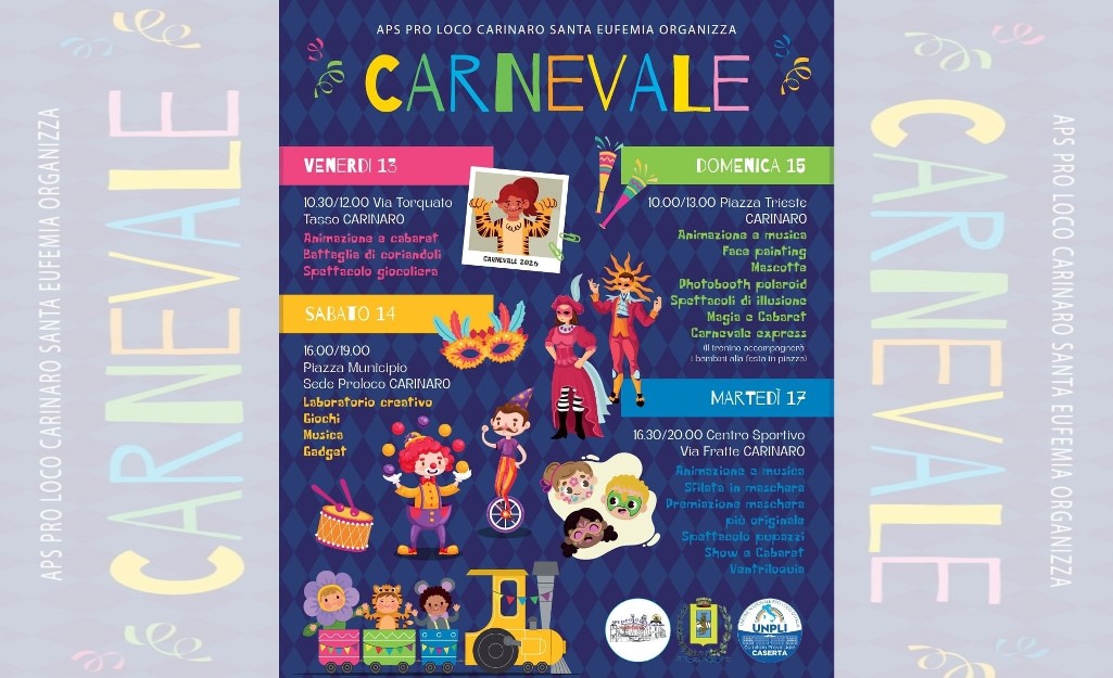 Carinaro (Caserta) – Quattro giornate di colori, animazione e spettacolo diffusi nel tessuto urbano. Il Carnevale 2026 torna a Carinaro con un programma articolato promosso dalla Pro Loco Sant’Eufemia, presieduta da Raffaella Mazzarella, in collaborazione con il Comune e l’Unpli Caserta, che dal 13 al 17 febbraio accompagnerà bambini e famiglie tra piazze, strade e spazi pubblici del paese.