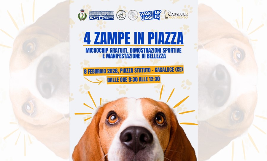 Casaluce (Caserta) – Domenica 8 febbraio, per tutta la mattinata, piazza Statuto si trasformerà in uno spazio dedicato agli amici a quattro zampe e alla responsabilità civica, con 4 Zampe in Piazza, iniziativa promossa dal Comune di Casaluce in collaborazione con Asl Veterinaria di Aversa, Associazione Cinofila Agro Aversano, Rete College Italia e le associazioni giovanili Wake Up-uagliù e Casaluce in Movimento. L’appuntamento è in programma dalle ore 9.30 alle 12.30.
