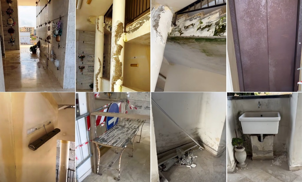La denuncia – Attraverso immagini pubblicate sui social, Minichino documenta le criticità presenti all’interno della struttura: macchie di umidità, segni di infiltrazioni lungo le pareti, impianti non in sicurezza e aree interdette. Elementi che, secondo quanto evidenziato, rappresenterebbero un potenziale rischio per i visitatori. A questo si aggiunge la questione del nuovo cimitero, definito un’opera incompiuta, mai ultimata e oggi in condizioni di abbandono. Il cittadino sottolinea, inoltre, come, sul sito istituzionale del Comune, non risultino ordinanze di interdizione relative alle aree ritenute pericolose, parlando di un “completo silenzio dell’amministrazione comunale” sulla vicenda.