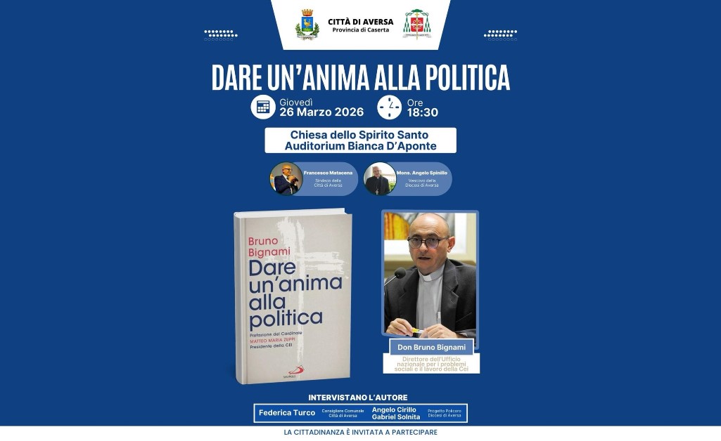 Aversa (Caserta) – Un confronto sul valore più alto dell’impegno pubblico, tra partecipazione democratica e responsabilità civile. È questo il senso dell’incontro in programma giovedì 26 marzo, alle ore 18.30, nella chiesa dello Spirito Santo – Auditorium “Bianca D’Aponte”, dove sarà presentato il libro “Dare un’anima alla politica” di don Bruno Bignami, direttore dell’Ufficio della Conferenza Episcopale Italiana per i Problemi sociali e il Lavoro.