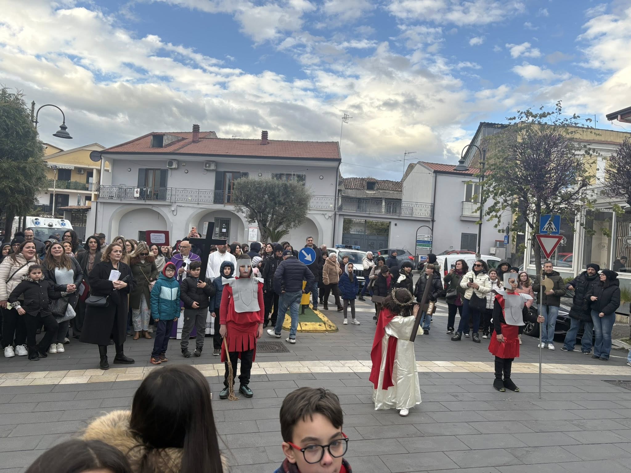 Don Antonio: “Piccolo miracolo di partecipazione” – Il parroco don Antonio Lucariello ha sottolineato il valore dell’esperienza, ritenendola “un momento di altissima spiritualità che resterà impresso nel cuore di ognuno di noi”. Un “piccolo miracolo di partecipazione” reso possibile grazie a una straordinaria sinergia di intenti, per la quale il sacerdote ha espresso un profondo e sentito ringraziamento “a tutti coloro che, con dedizione e spirito di servizio, hanno contribuito alla realizzazione di questo evento. Un ringraziamento alla dirigente scolastica Cantile, ai docenti, al sindaco Dell’Aprovitola con l’intera Amministrazione, alla Polizia Municipale, all’associazione Carità, alle catechiste, ai piccoli coristi e a tutti i ragazzi che hanno permesso che questo momento di fede si svolgesse in un clima di armoniosa unione”. “Vedere le istituzioni, la scuola e le famiglie camminare insieme dietro la Croce – ha concluso don Antonio – ci ricorda che la comunione non è solo una parola, ma un impegno quotidiano”. SOTTO UNA GALLERIA FOTOGRAFICA