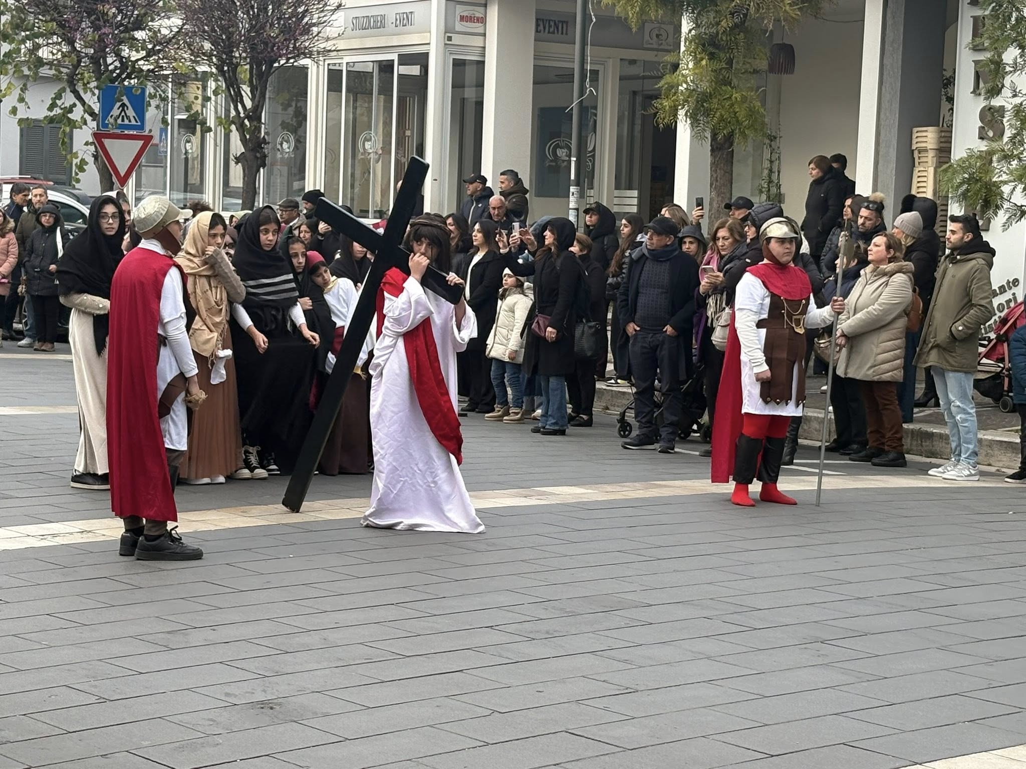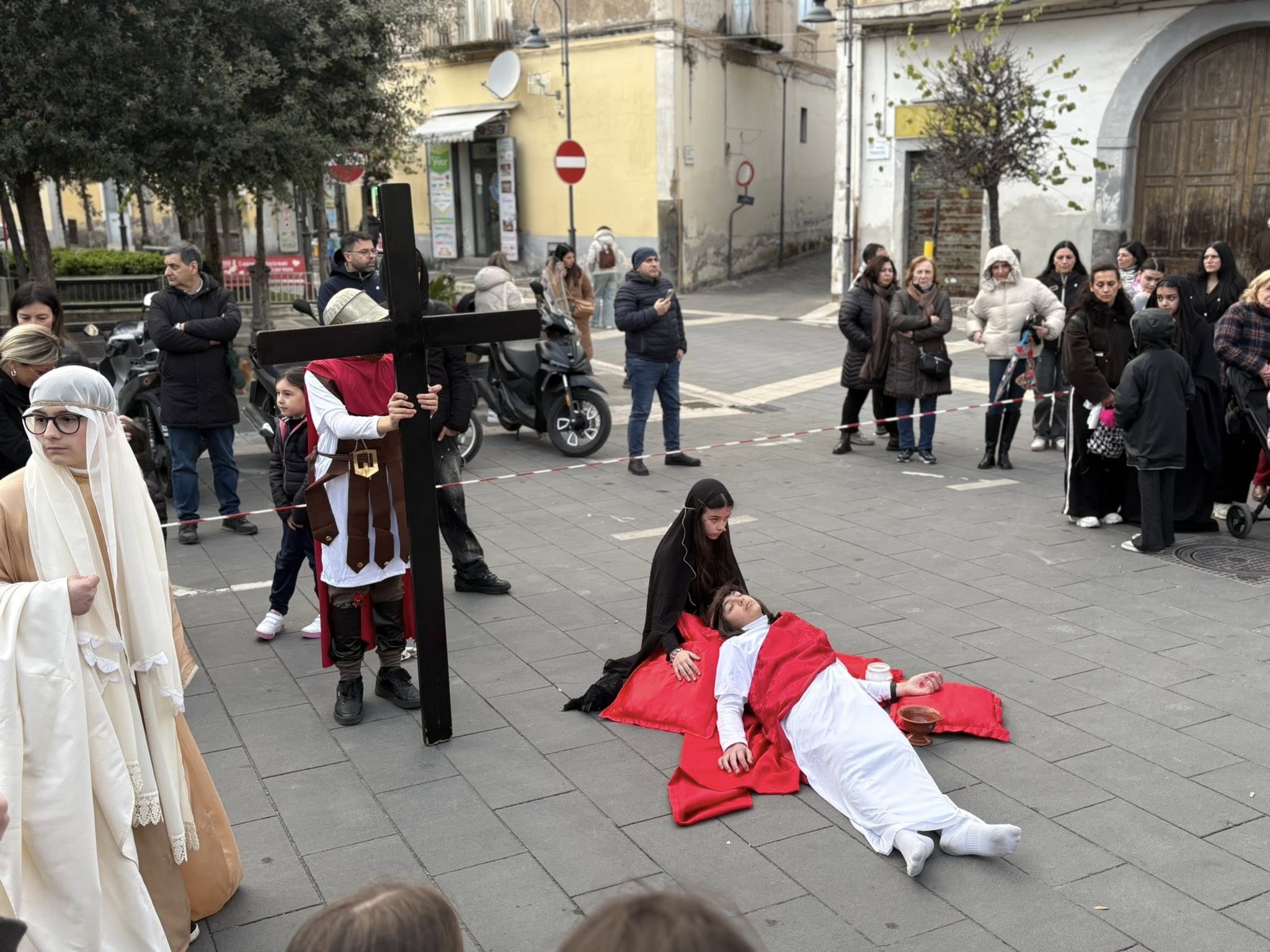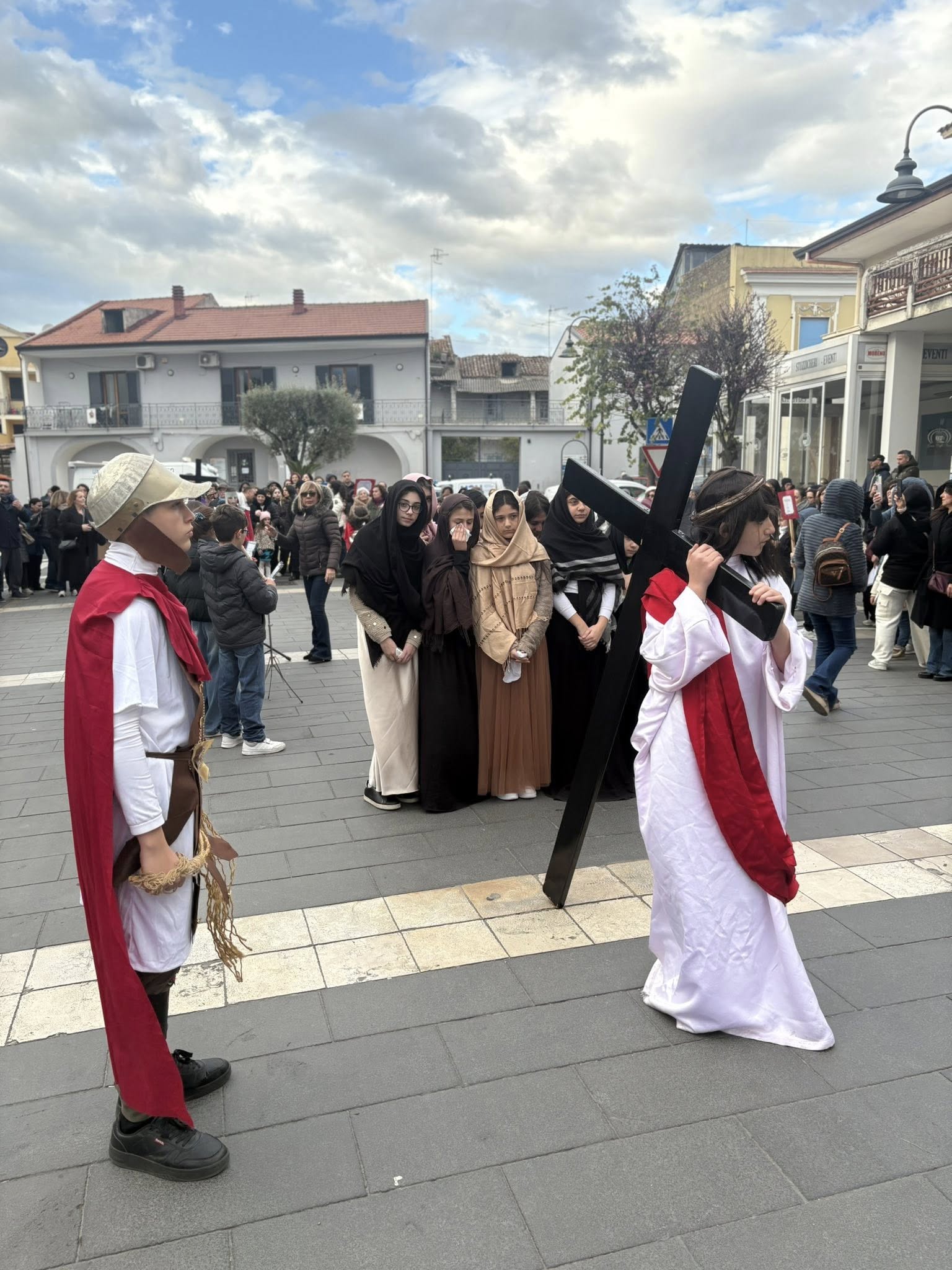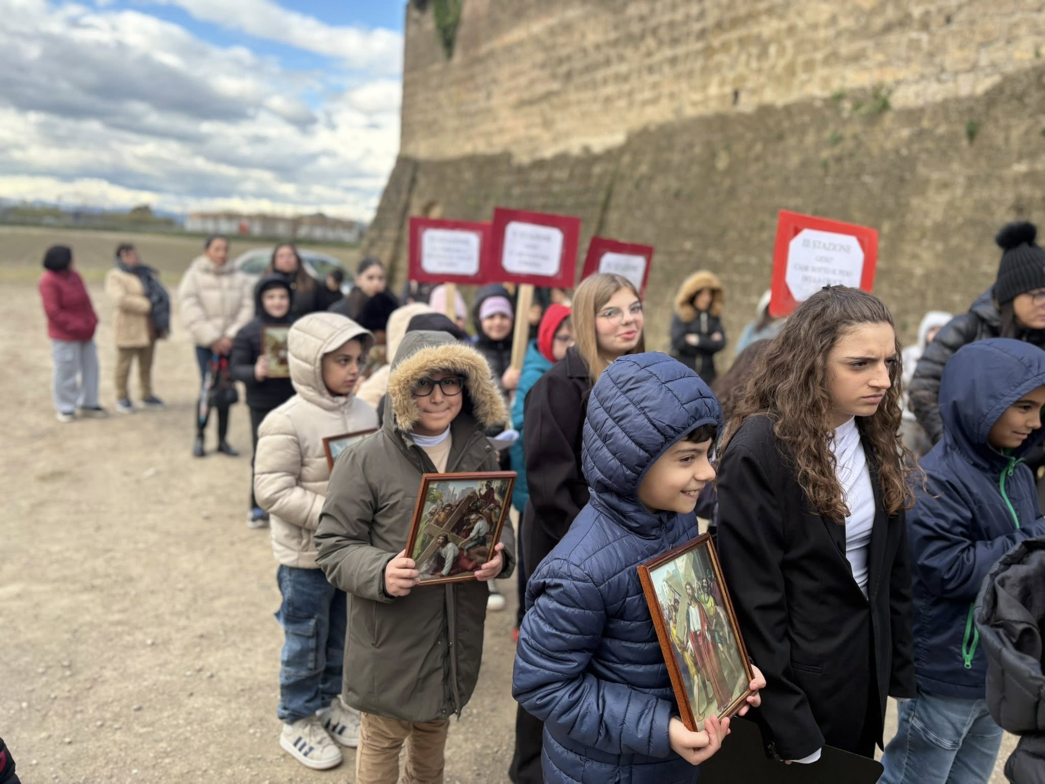 Il percorso con studenti e famiglie – A rendere particolarmente significativa la rappresentazione sono stati gli studenti, veri protagonisti dell’evento. I ragazzi hanno interpretato le diverse stazioni, indossando abiti d’epoca e dando vita ai momenti della Passione di Cristo. Un impegno sostenuto anche dalle famiglie che, insieme ai docenti, hanno contribuito in modo determinante alla riuscita delle rappresentazioni. La Via Crucis è partita dall’area campestre del Palazzo di Casignano, attraversando via Piave fino a raggiungere piazza Trieste. Un cammino condiviso da alunni, insegnanti e cittadini che ha coinvolto l’intera comunità. Al termine, è stato offerto un dono pasquale a tutti gli alunni presenti.